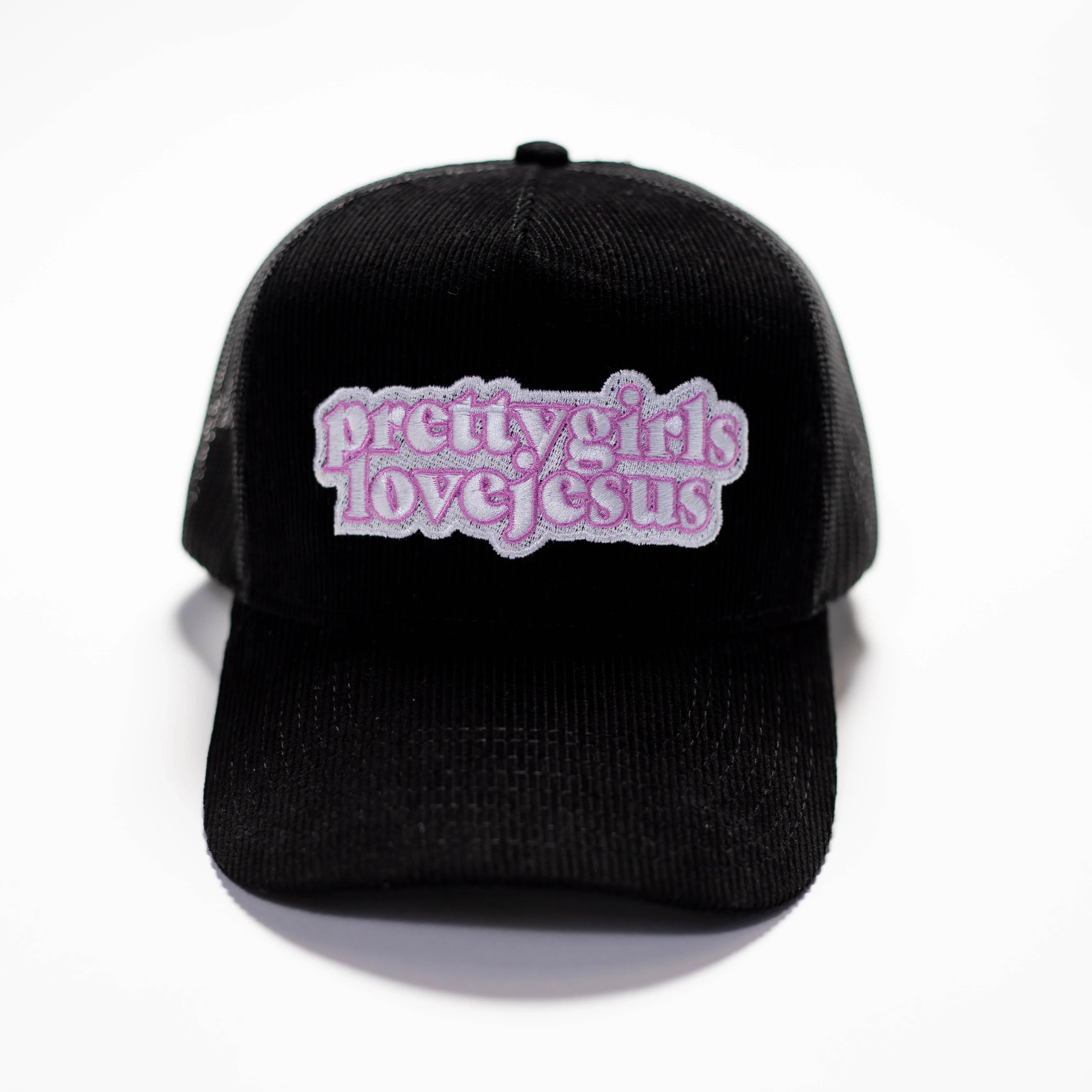 The Pretty Girls Love Jesus bestselling trucker hat is now available in this black and pink colorway! Trucker features the Pretty Girls Love Jesus mantra accented in a softer pink outline. She is also satin lined. Supply is limited in this colorway!