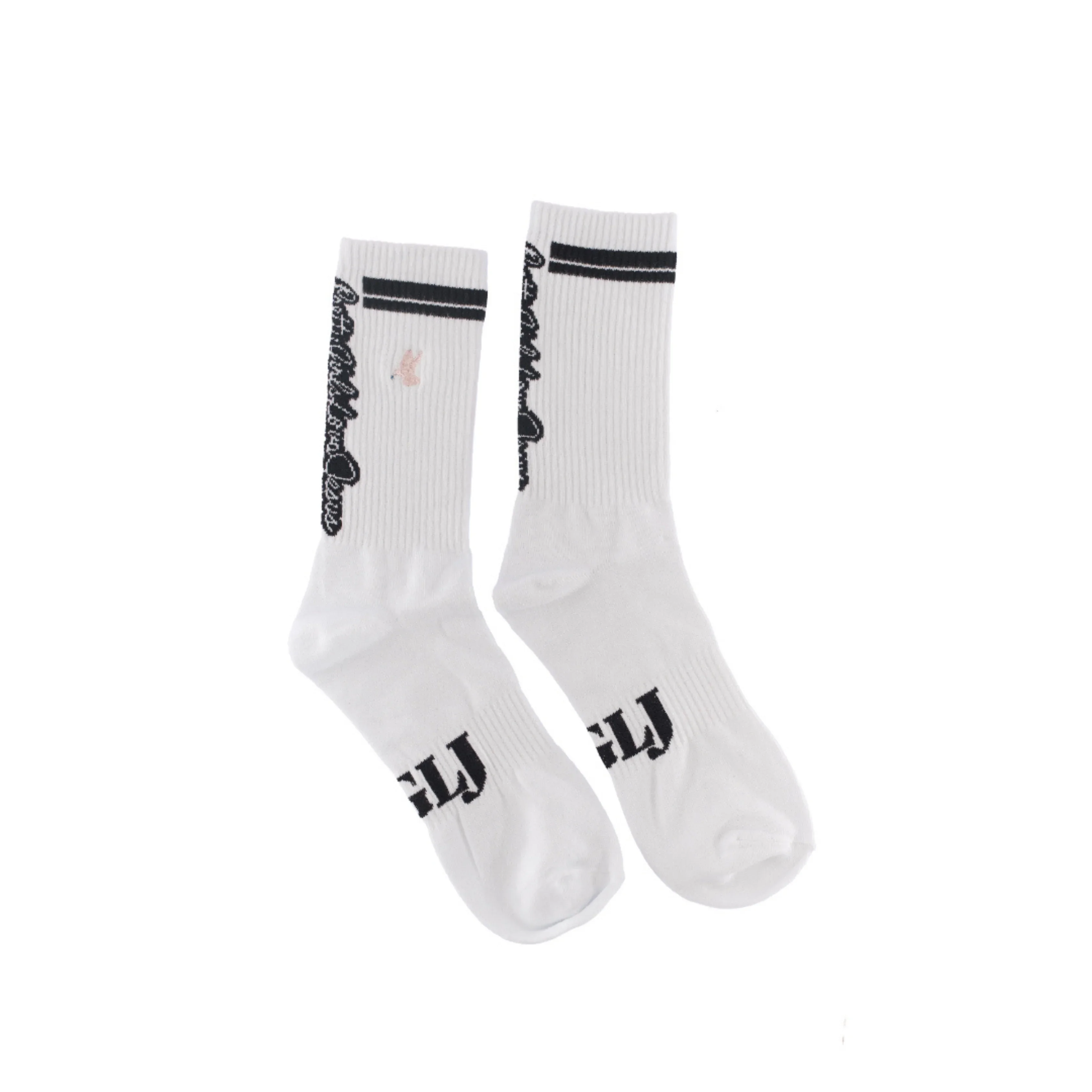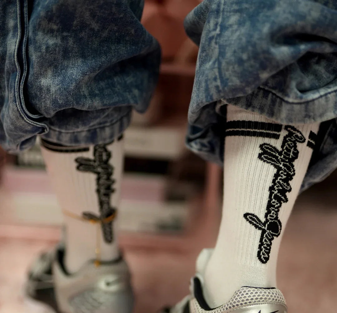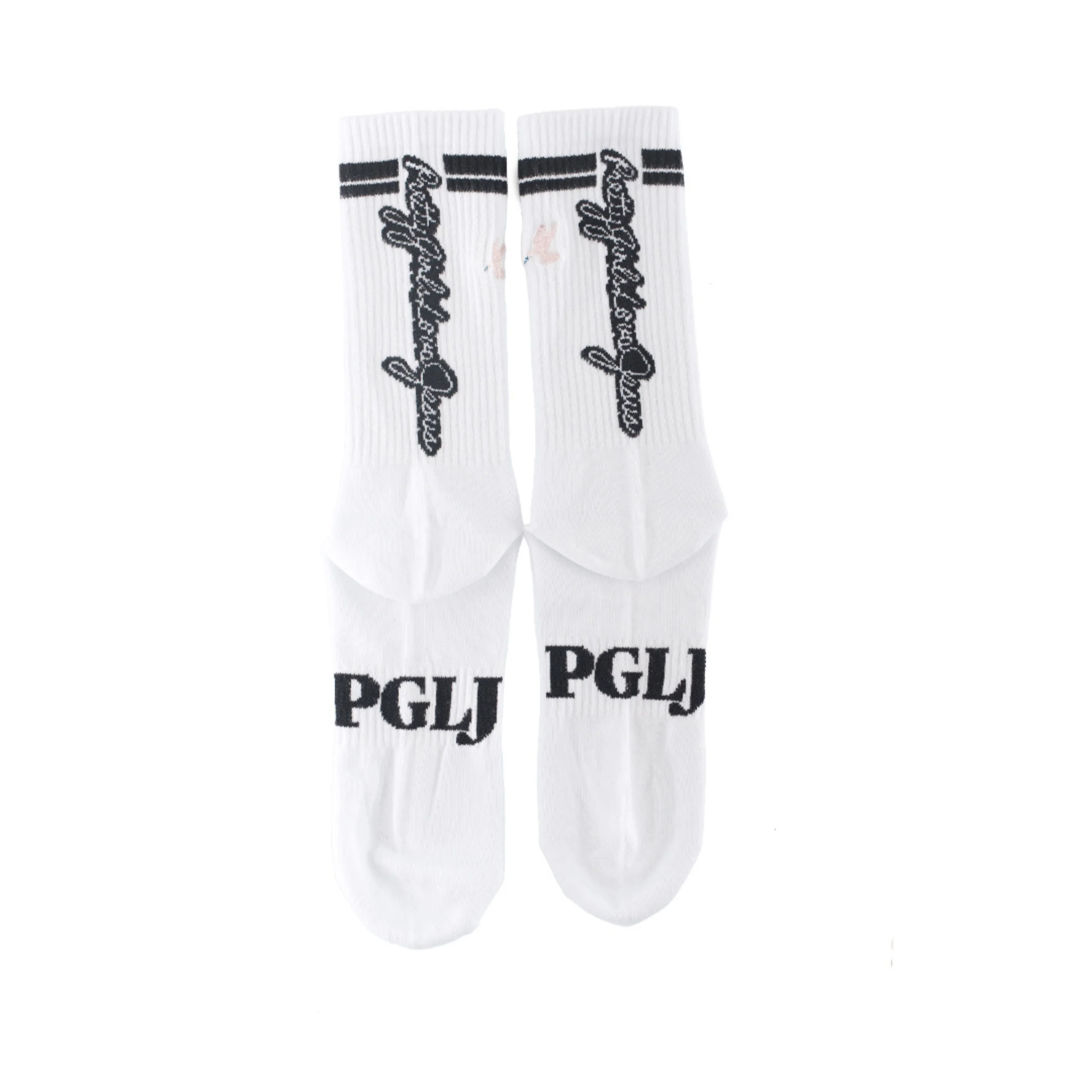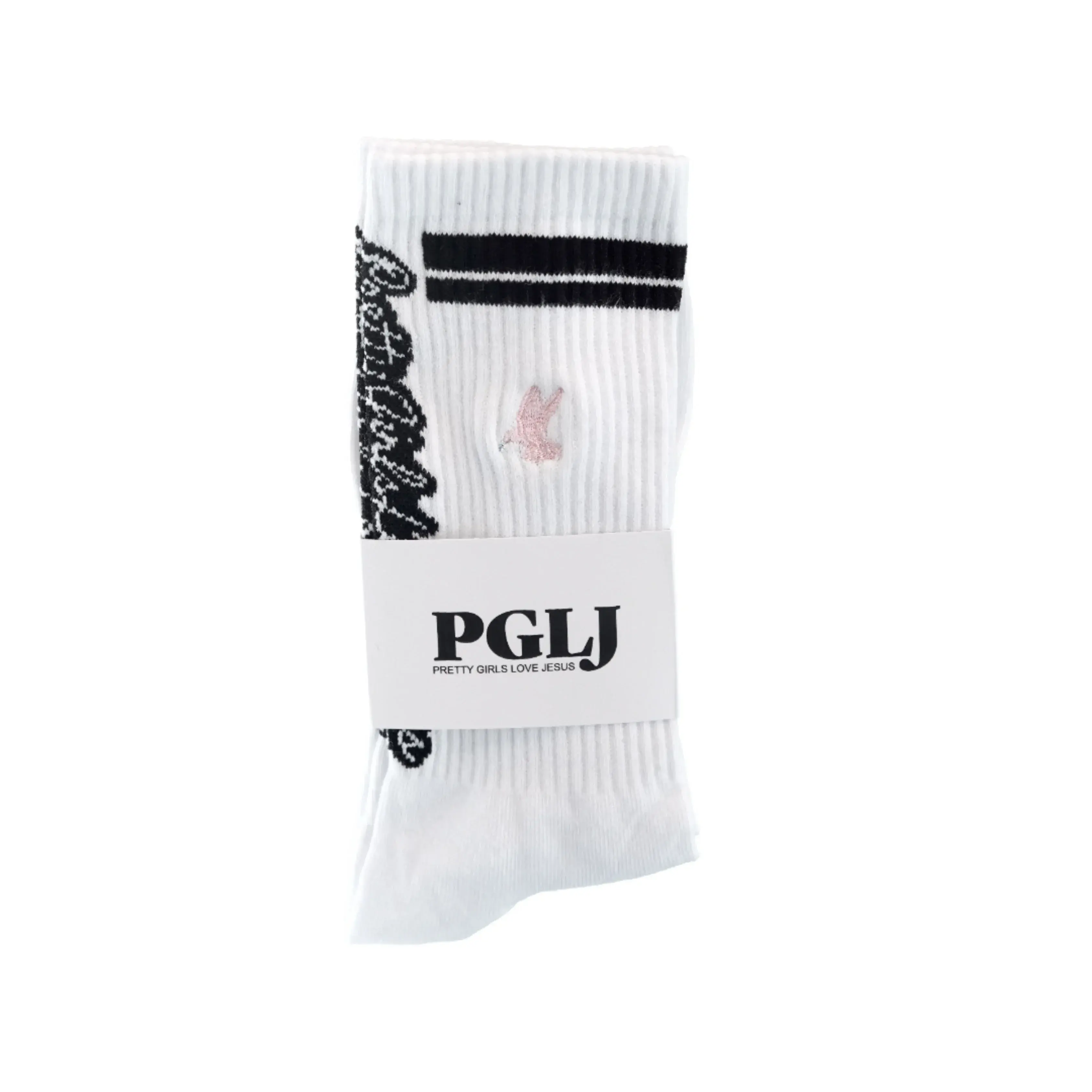 Details: Rib knit calf-high socks. Pink embroidered dove with designer black outlined Pretty Girls Love Jesus mantra running down the spine